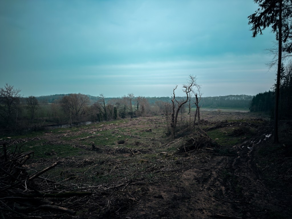 I had arrived at the fringes of Asney Woods on the hunt for some lumps and bumps – the remains of an 18th century folly, once within the grounds of Gwernheylod, from which a small cannon was fired on occasion of celebration. All was well, all was calm as the We and I followed the footpath along the Dee towards the woods. There was a mist on the river, and geese glided on the smooth, swift waters with misleading ease – deceptive bliss. But this sense of rural idyll was short-lived. Upon reaching the base of the hill upon which the remaining earthworks were said to be found, the We and I, the Border Terrorists in tow, were confronted with a scene of devastation. Much of the plane here, beside the Dee had been cleared of trees, but my immediate impression was that it had been shelled. In truth, it looked like something from the Somme of 1916 – a blasted, broken landscape of shattered tree stumps and seared earth. I would not have been wholly surprised to have seen zigzagging trenches and a seething mass of British squaddies within them.