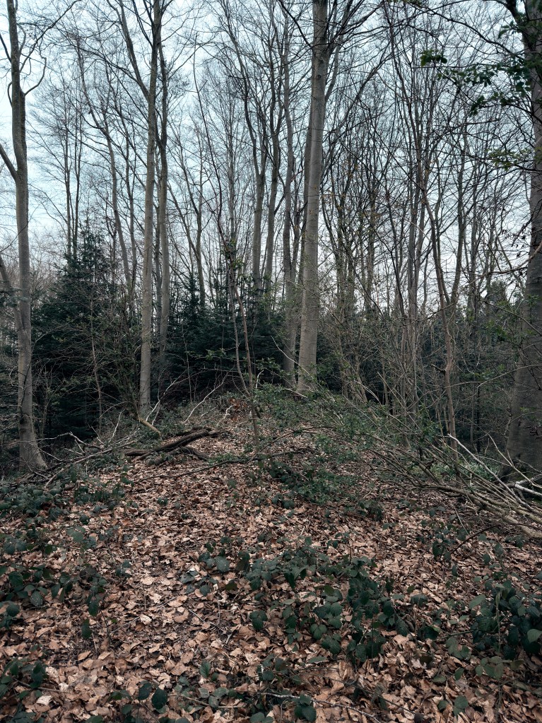 I had hoped that on reaching the height of the hill, I might find the sun as something more than slight light through a reluctant canopy. I was disappointed. If anything, the atmosphere was more sullen, as if the landscape was annoyed I had made it this far. Mindful that I had made this climb to see if the outlines of a fort like earthwork could be found, I began to ferret around. But, I jest not when I say I would find myself, without knowingly doing so, glancing over my shoulder every few moments.