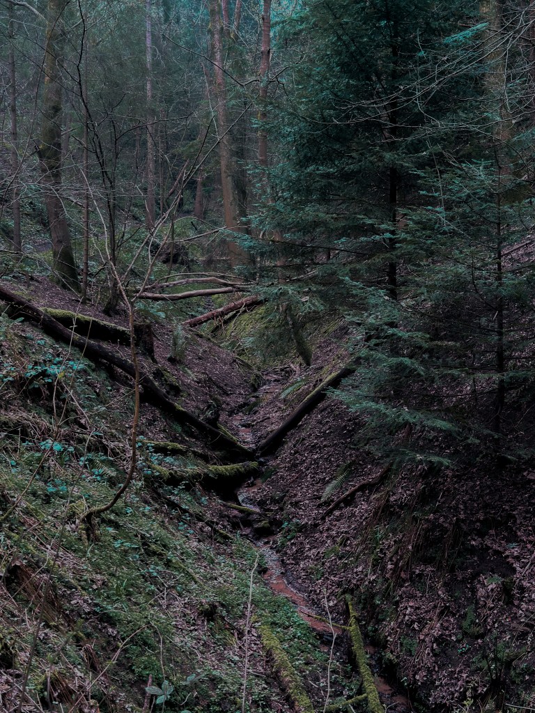 Still, I can only tell you how I felt on entering Asney Woods, and I felt immediately unwelcome. The path into the trees was somewhat precarious – a wild root broken and water scoured track. Stream rivulets were crossed by rotting pallets and branches. Rain from the day before was still draining from the tree canopy above, and even the soil beneath my feet was dishonest, treacherous – slough beneath my boots and liable to slip away from the tread in a moment. But I climbed nonetheless. Thick bramble will ever try to trip you – nothing new there, but its denseness seemed oppressive and malevolent – ankle and eye height, thorns and prickles dragging languidly across my skin. And all around me, the sense of being watched, and watched intently, avidly, angrily.